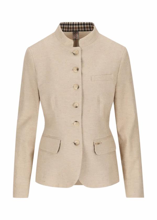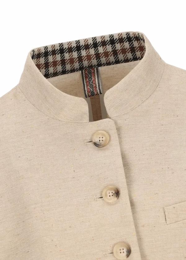 Futter: Halbgefüttert - Besonderheiten: Hochwertige Mischung aus den Naturfasern Baumwolle und Leinen, karierter Kontraststoff an der Innenseite des Kragens, Rückenschlitz, Band im Folklore-Look als Jackenaufhänger, Logoplakette in Hornoptik an der linken Tasche