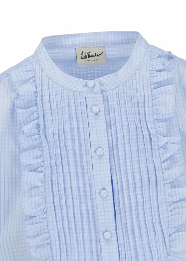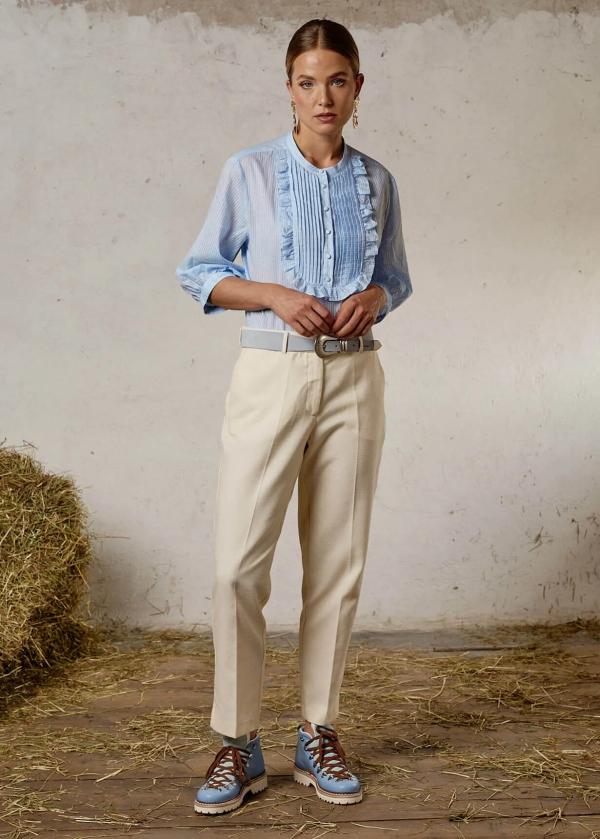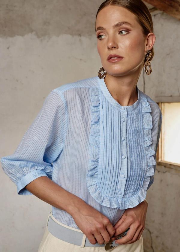 Knopfleiste: Kurze Knopfleiste - Besonderheiten: Weite Dreiviertelärmel, plissiertes Plastron mit Rüschen, mit Stoff überzogene Knöpfe