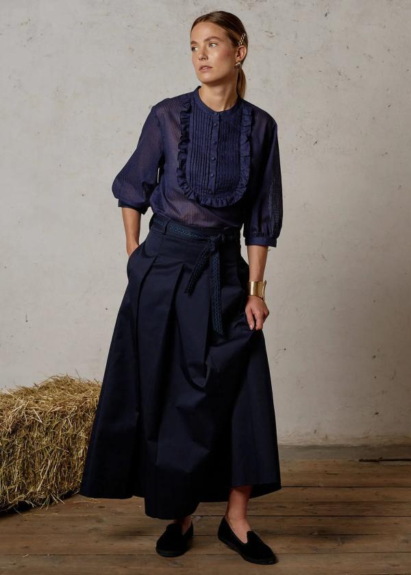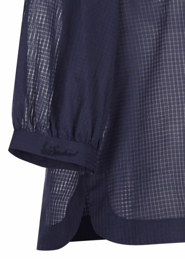 Besonderheiten: Weite Dreiviertelärmel, plissiertes Plastron mit Rüschen, mit Stoff überzogene Knöpfe - Unser Model Sophie ist 1,77 m groß und trägt Größe S.