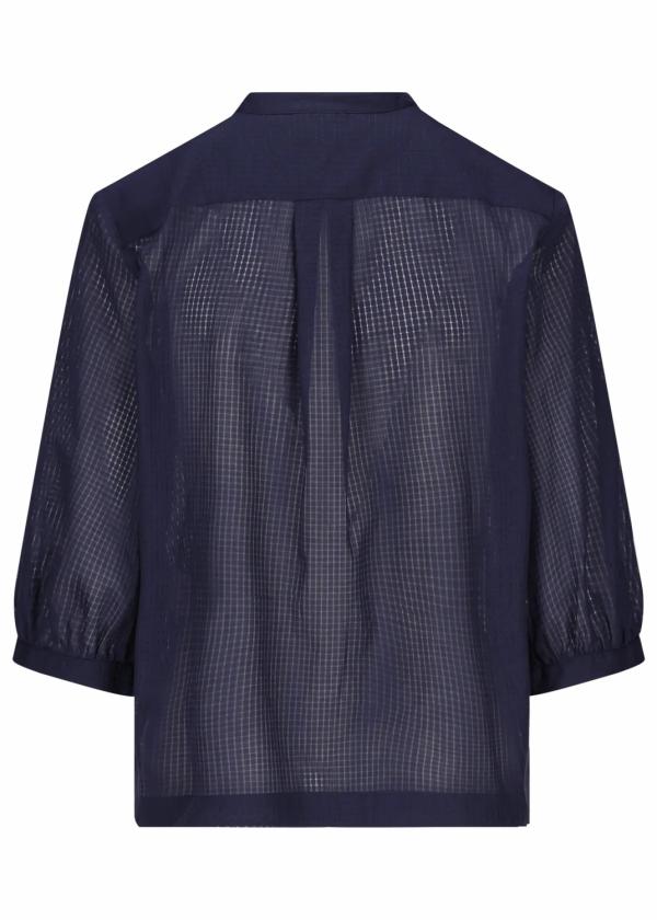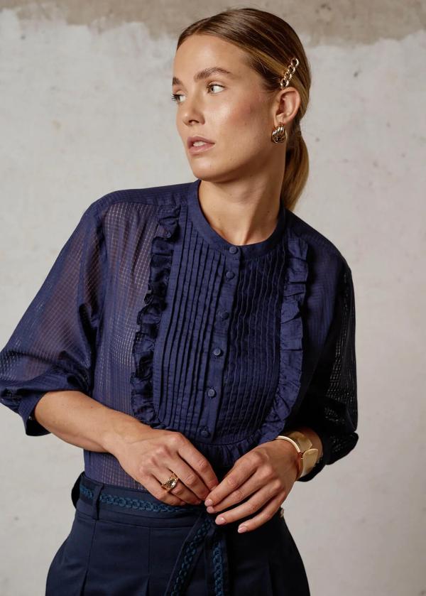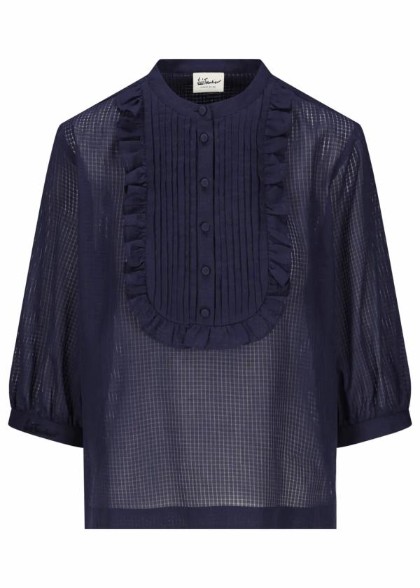 - Diese Bluse im Comfort Fit mit Rundhalsausschnitt und weiten Ärmeln in Dreiviertellänge besteht aus einem leichten, transparenten Baumwollstoff. Das plissierte Plastron mit Rüschensaum und die mit Stoff überzogenen Knöpfe an der kurzen Knopfleiste sind die Details, die sie auszeichnen.