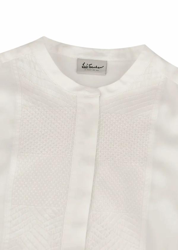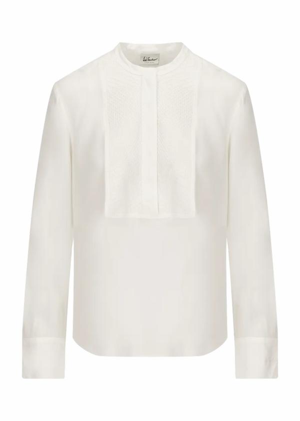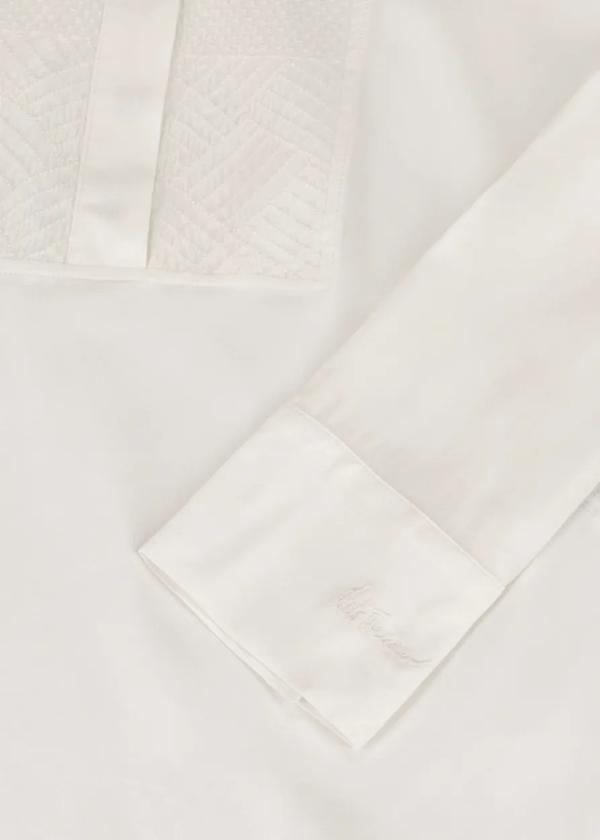 Knopfleiste: Kurze verdeckte Knopfleiste mit Knöpfen aus echtem Perlmutt - Besonderheiten: Stückgefärbtes Seidenmischgewebe, besticktes Plastron, seitliche Schlitze