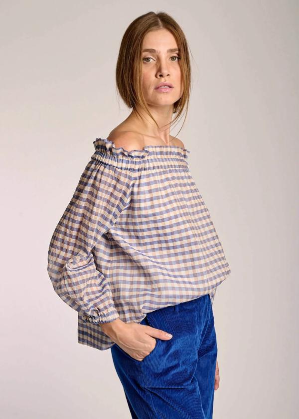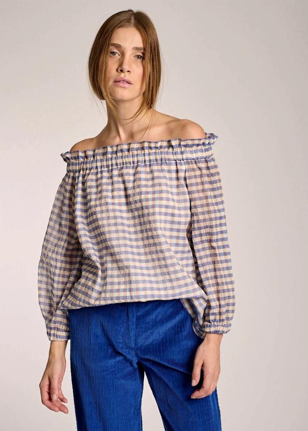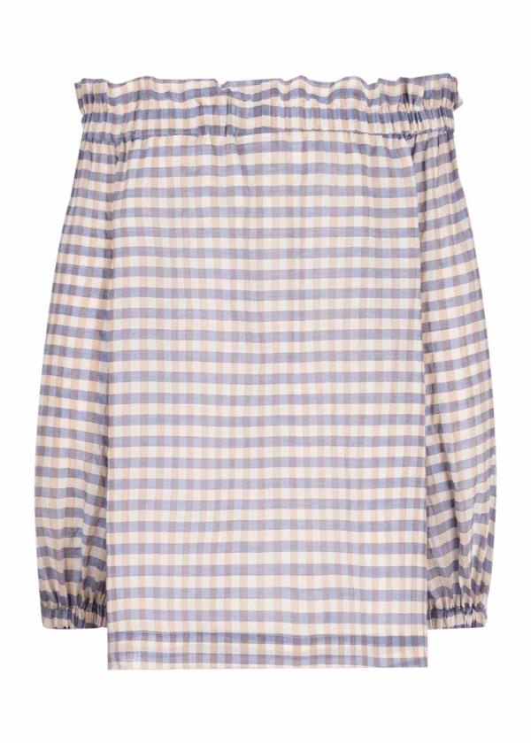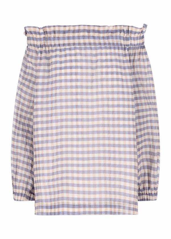 - Diese schulterfreie Bluse im Comfort Fit mit gerafftem Carmen-Ausschnitt und Ballonärmeln in Dreiviertellänge besteht aus komfortablem Baumwollstretch in Seersucker-Qualität mit zeitlosem Karomuster.