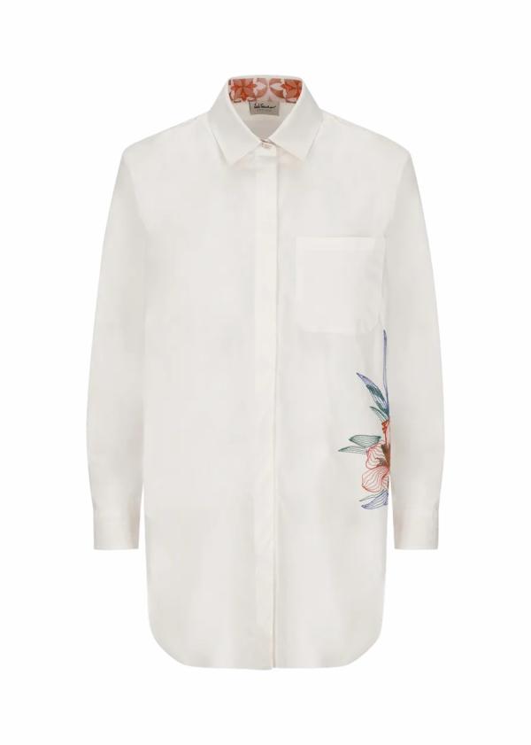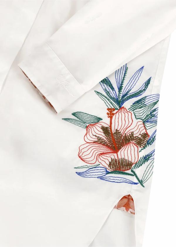 - Französischer Kragen, durchgehende versteckte Knopfleiste, große florale Stickerei an der Seite