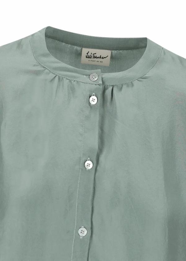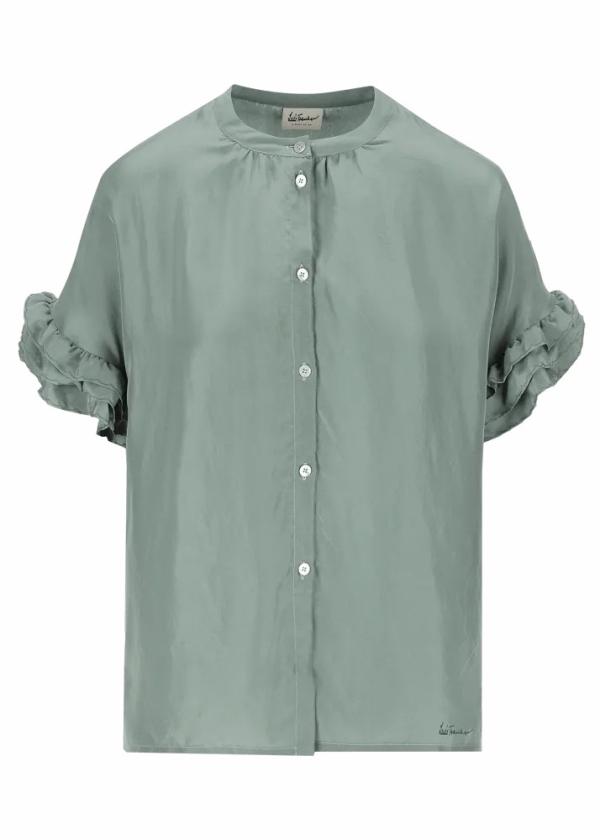 Knopfleiste: Durchgehende Knopfleiste mit Knöpfen aus echtem Perlmutt - Besonderheiten: Rüschen mit Stickerei an den Ärmeln, leichte Raffung am Ausschnitt, Seitenschlitze, dezente Logostickerei am linken Saum