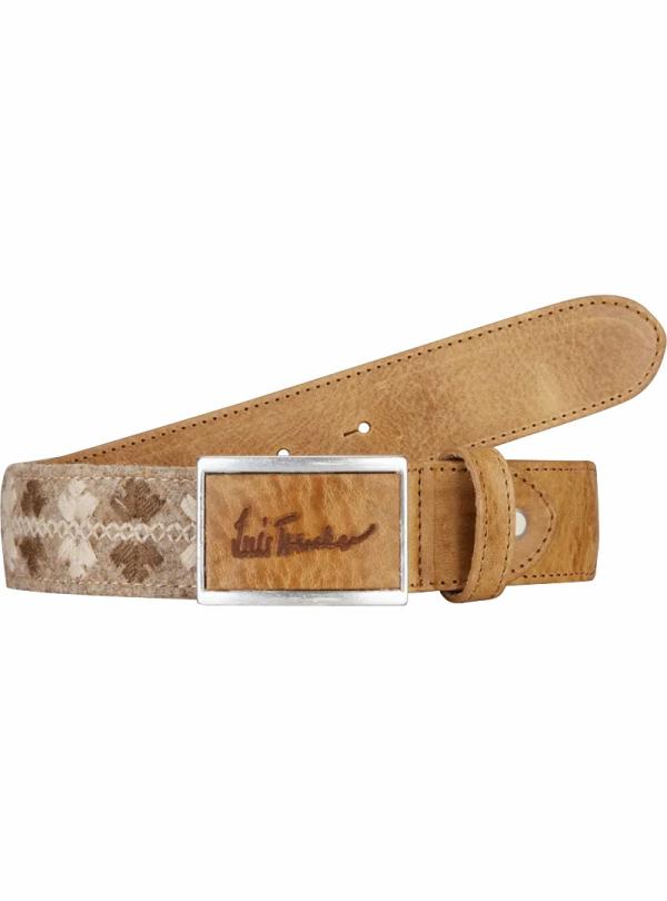 - Ledergürtel mit besticktem Lodeneinsatz und metallisch eingefasster Lederschnalle mit gelasertem Logo