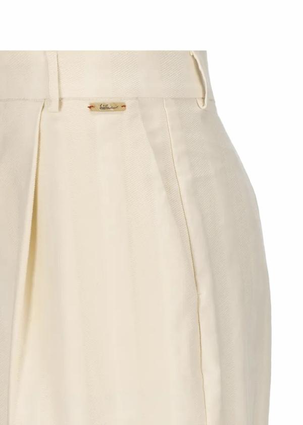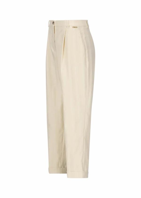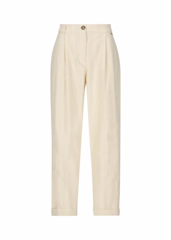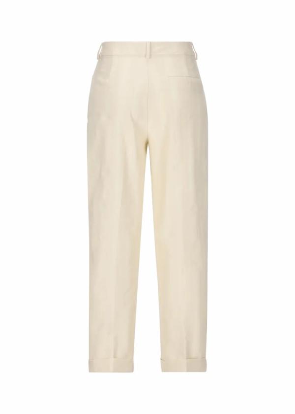 Taschen: Zwei seitliche Eingrifftaschen - Besonderheiten: Angenehmer Mix aus den Naturfasern Baumwolle und Leinen, Bund- und Bügelfalten, Saumumschlag, Band im Folklore-Look innen am Bund, Logoplakette links am Bund