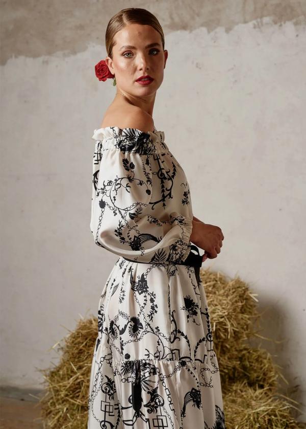 Besonderheiten: Reine Seide mit exklusiv für Luis Trenker entworfenem Print, Ballonärmel mit elastischem Abschluss in Dreiviertellänge, abnehmbarer Wildledergürtel zum Knoten an der Taille - Unser Model Sophie ist 1,77 m groß und trägt Größe 42.