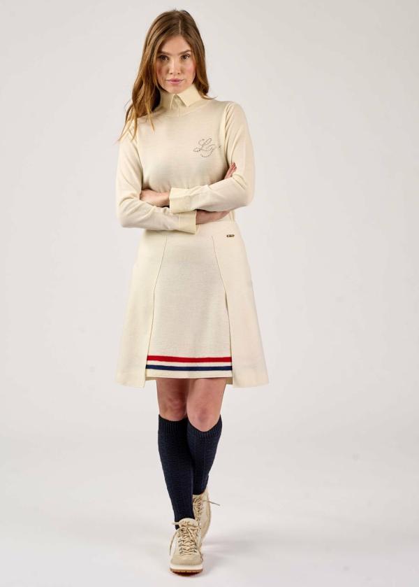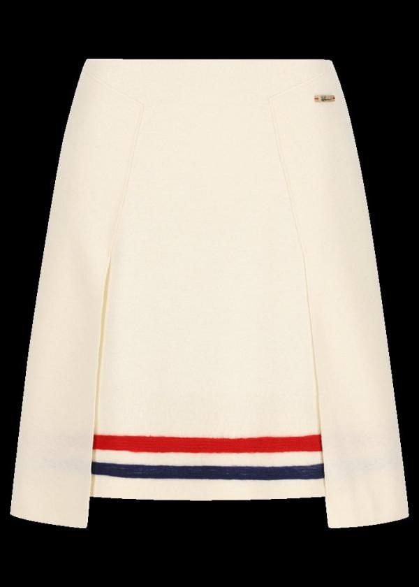 - Dieser kurze Rock im Regular Fit mit raffinierten Schlitzen besteht aus reiner Schurwolle, verarbeitet zum traditionellen Trenker-Material Walk, und erhält durch die beiden gestickten Streifen in Kontrastfarben einen sportlichen Touch.