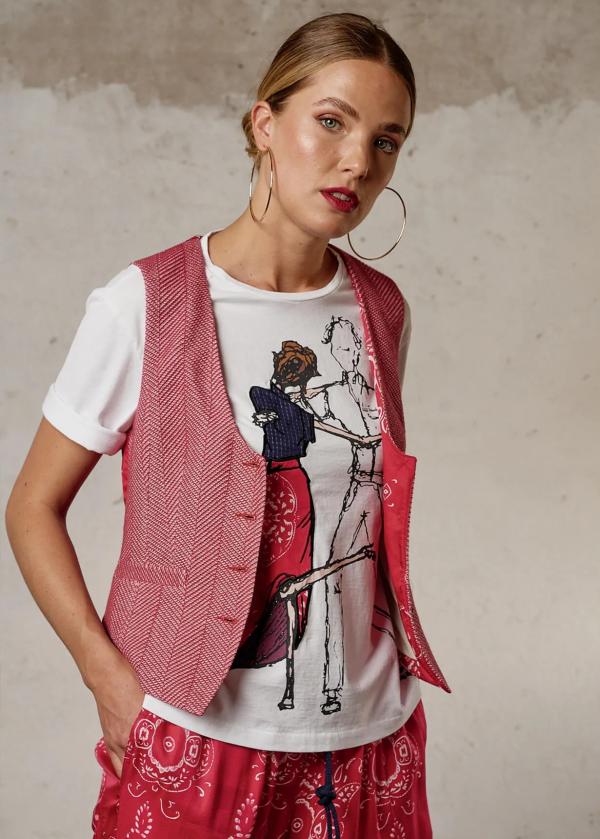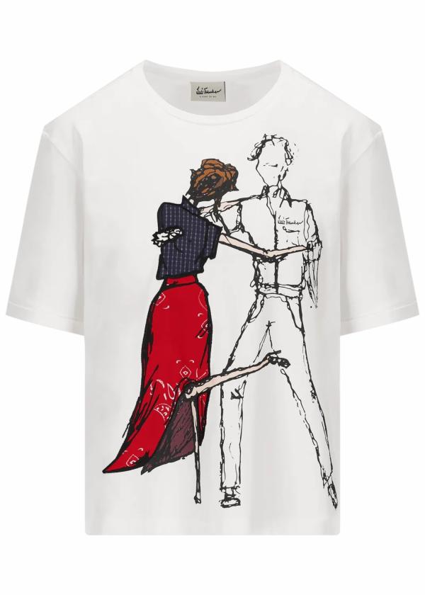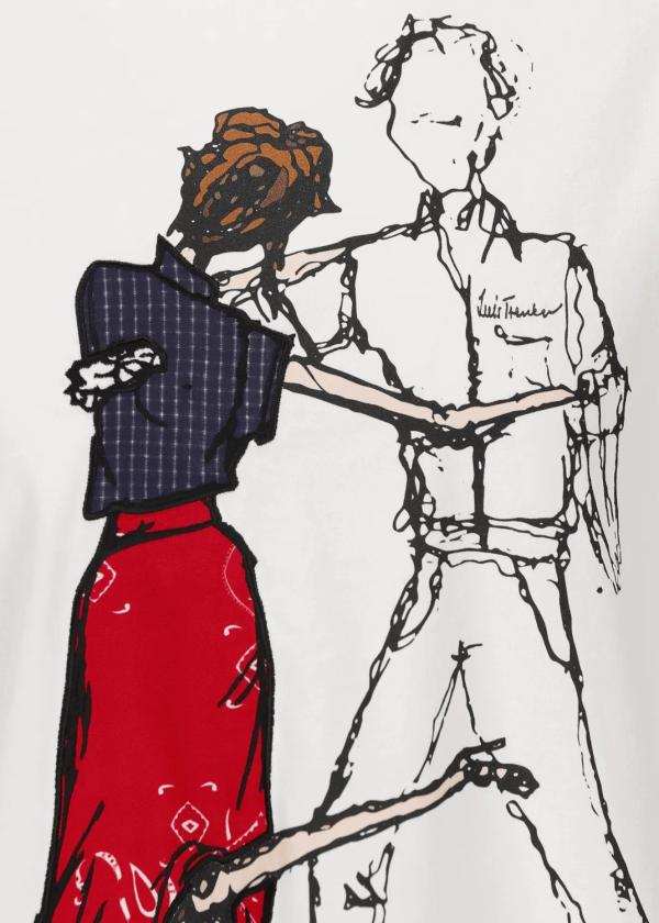 Besonderheiten: Extra Tragekomfort, kurze Ärmel mit Umschlag, Skizze eines Tango tanzenden Paares als Print mit Stoffapplikationen - Unser Model Sophie ist 1,77 m groß und trägt Größe S.