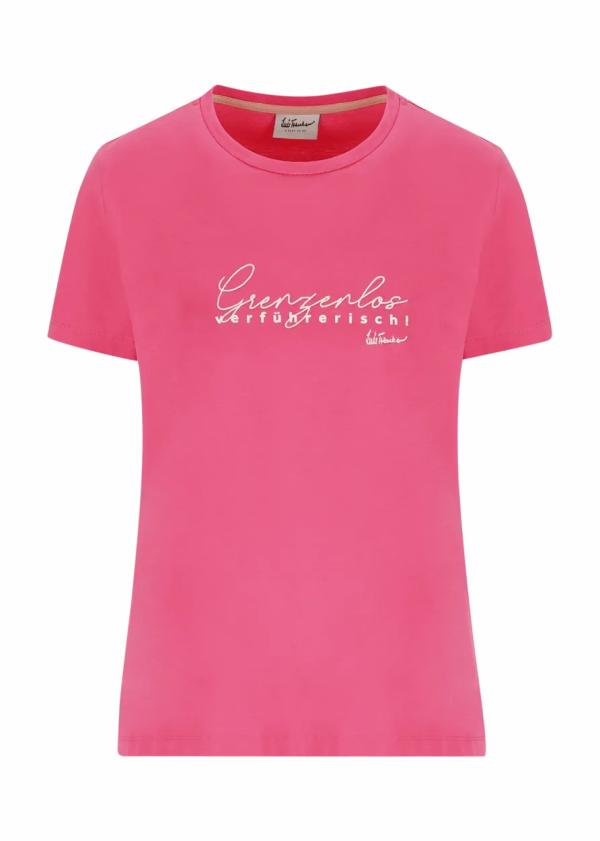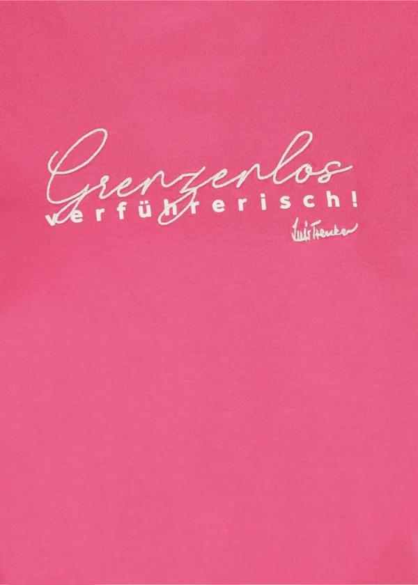 - Dieses T-Shirt im Regular Fit mit kurzen Ärmeln und Rundhalsausschnitt besteht aus reiner Baumwolle und trägt den Schriftzug „Grenzenlos verführerisch“ als Stickerei und Print auf der Brust.