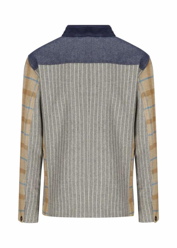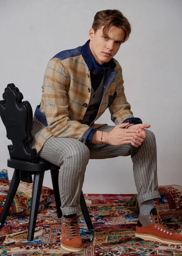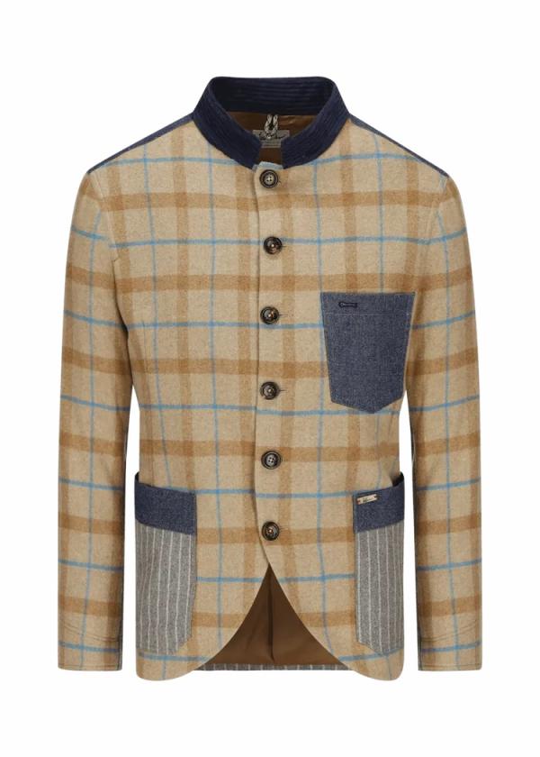 - Dieser vollständig gefütterte Blazer im Comfort Fit mit Stehkragen besteht vorne aus einem Wollmix mit exklusiv für Luis Trenker designtem Karomuster. An Rücken und Taschen, sowie an der Unterseite der Ärmel wurde reine Schurwolle mit Nadelstreifen verarbeitet, während Details aus Twill und Cord den Materialmix komplett machen.