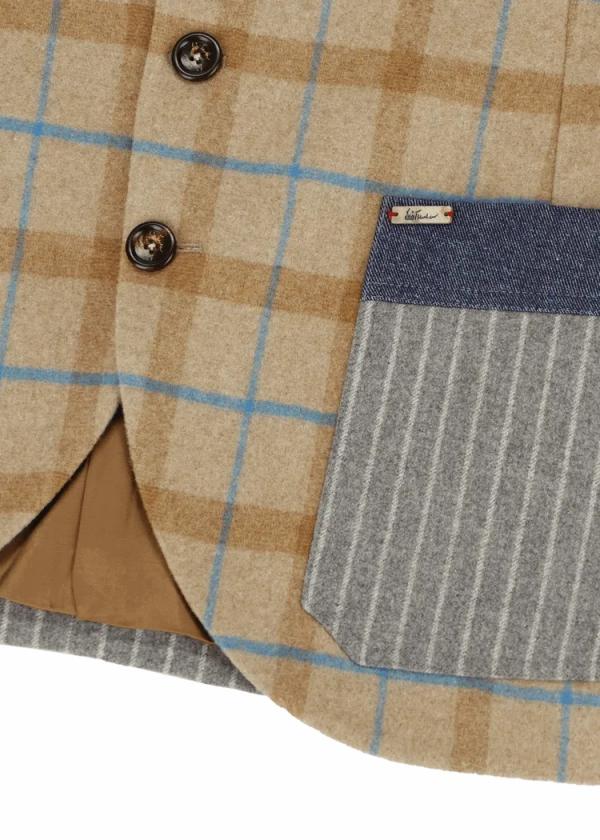 Herkunft: Stoff aus Italien - Besonderheiten: Rücken und Taschen aus reiner Schurwolle mit Nadelstreifen, exklusiv für Luis Trenker designter und gefertigter Wollmix mit Karomuster vorne, Twill-Einsätze an Taschen, Brusttasche und hinterem Schulterbereich, Logoplakette in Holzoptik an der linken Tasche