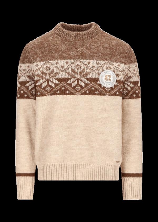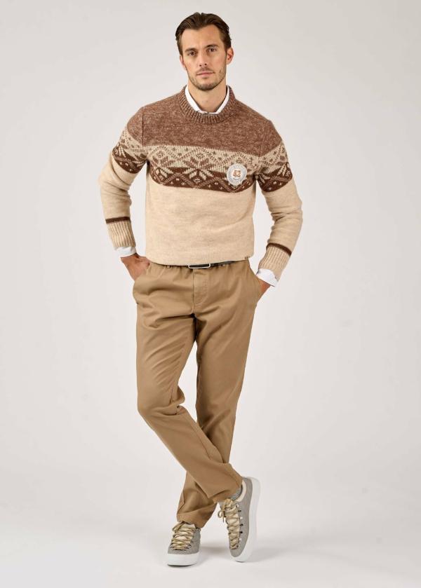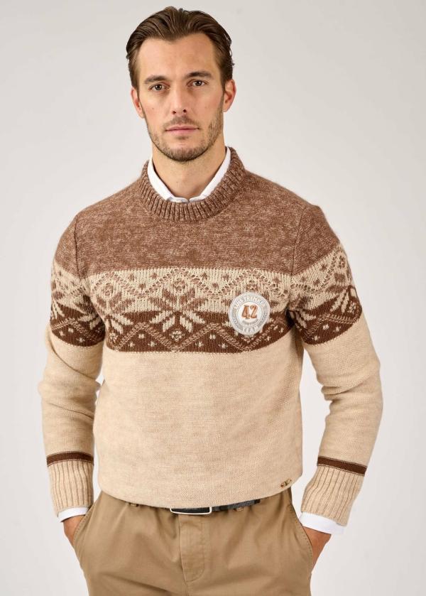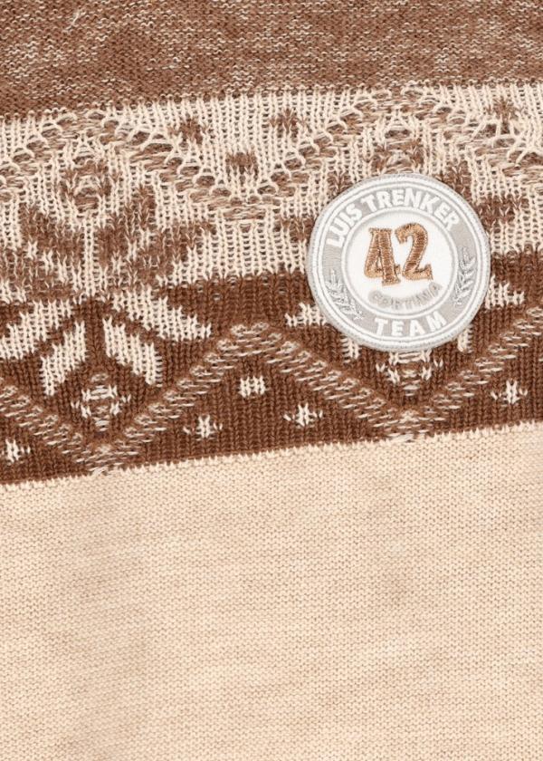Besonderheiten: Extra Tragekomfort, Jacquard mit Norwegermotiv, Patch mit der ikonischen Zahl 42 (Luis Trenkers Startnummer bei sämtlichen Skirennen) als Eyecatcher an der Brust, Ausschnitt, Saum und Bündchen im Rippstrick, Logoplakette in Hornoptik links am Saum - Unser Model Federico ist 1,88 m groß und trägt Größe L.