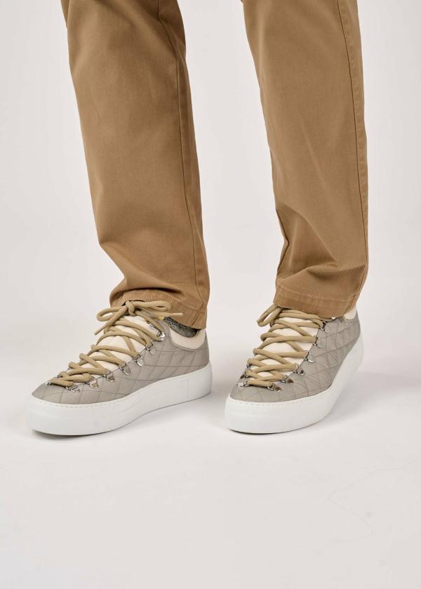 - Dieser Sneaker kombiniert hochwertiges Glattleder mit gestepptem Nylon und schafft so einen einzigartigen Materialmix. Ein cooler Stilbruch zum sportlichen Design: Die metallischen Ösen im Bergschuh-Look, die für den nötigen alpinen Touch sorgen.