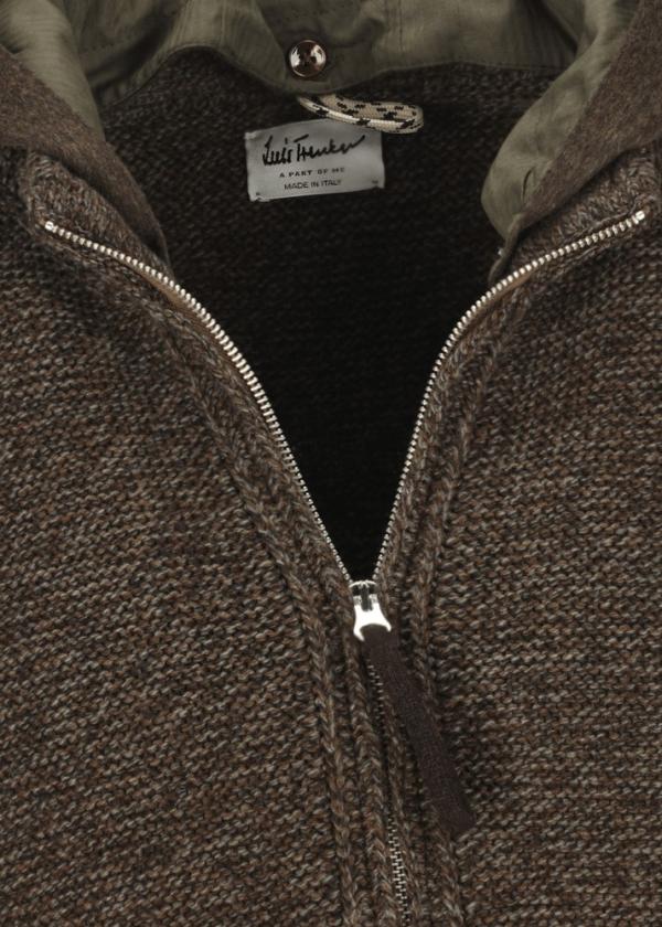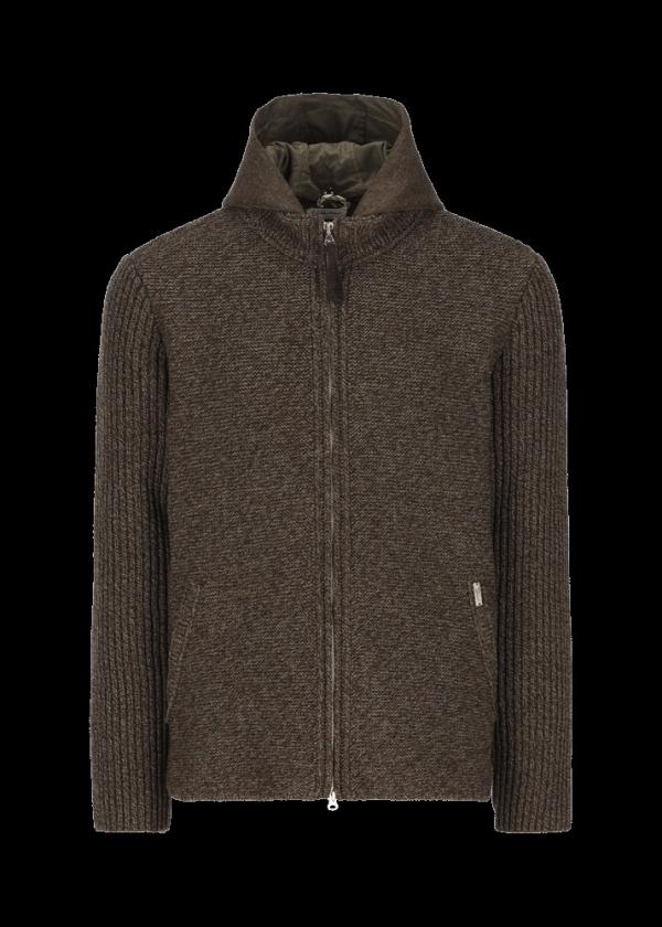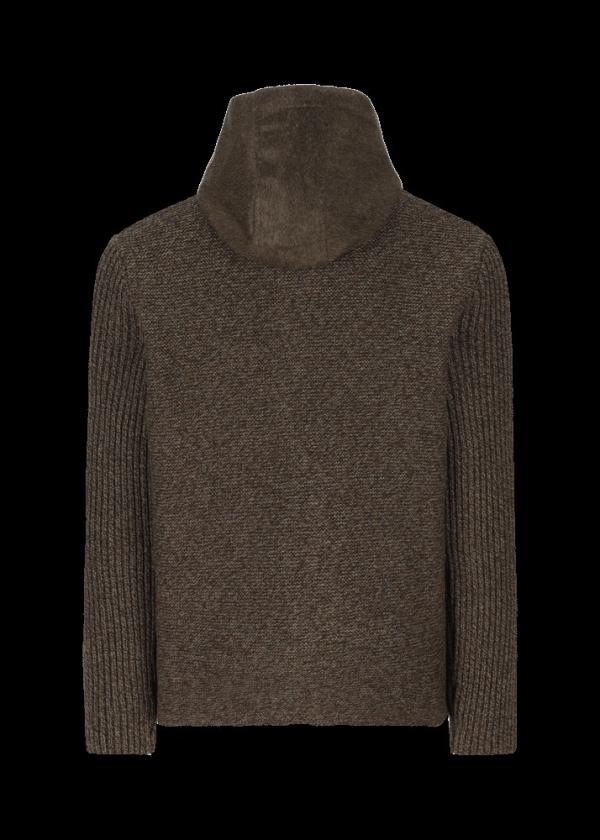 Besonderheiten: Extra Tragekomfort, Vorder- und Hinterseite traditionell im Stil der „Sarner Janker“ links gestrickt, Kapuze aus Loden, Logoplakette in Hornoptik an der linken Tasche