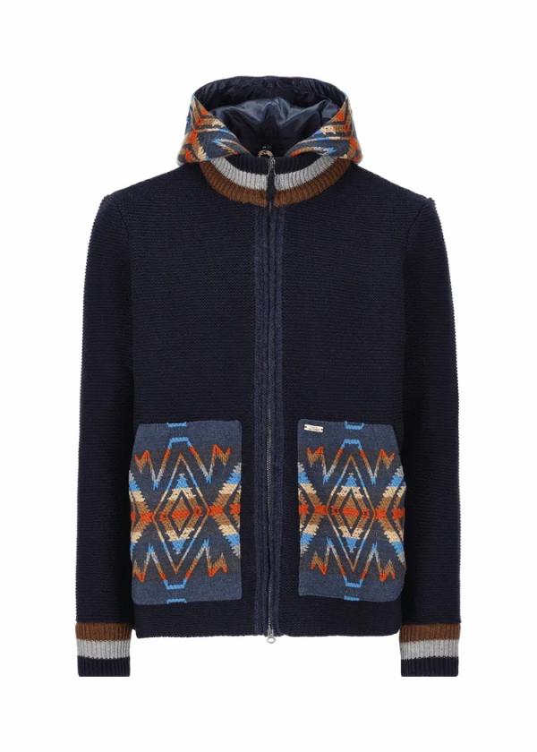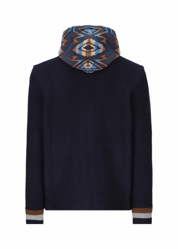 Herkunft: In Italien gefertigt - Besonderheiten: Extra Tragekomfort, traditionell im Stil der „Sarner Janker“ links gestrickt, Kapuze und Taschen aus exklusiv für Luis Trenker gefertigtem Ethno-Jacquard-Stoff, Kragen und Bündchen im Rippstrick mit kontrastfarbenen Streifen, Logoplakette in Holzoptik an der linken Tasche